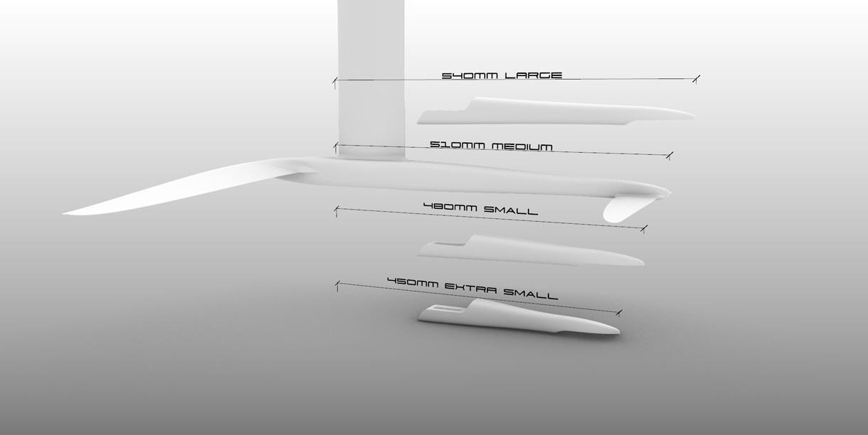 Ofrecemos cuatro longitudes de fuselaje para aumentar la versatilidad de nuestra gama. Además del mediano, ofrecemos un fuselaje «extra pequeño», «pequeño» y «grande». Estos se construyen con una diferencia incremental de 30 mm. Los tamaños más pequeños permiten una bomba de cadencia más alta y añaden aún más maniobrabilidad a la gama, mientras que el fuselaje grande proporciona una mayor estabilidad de cabeceo, por lo que es ideal para principiantes. Muchos foilers de ceñida prefieren el fuselaje grande por su estabilidad adicional y su bomba de cadencia más lenta. Todos los tamaños presentan el mismo sistema único de unión y superficie de montaje de la cola que nuestro fuselaje mediano.