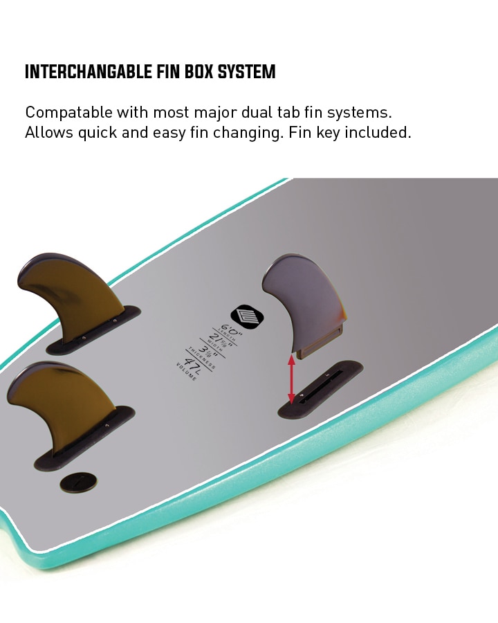 • Fin Box: Compatible with most major fin brands. Allows quick and easy fin changing. Secures with fin key (included).