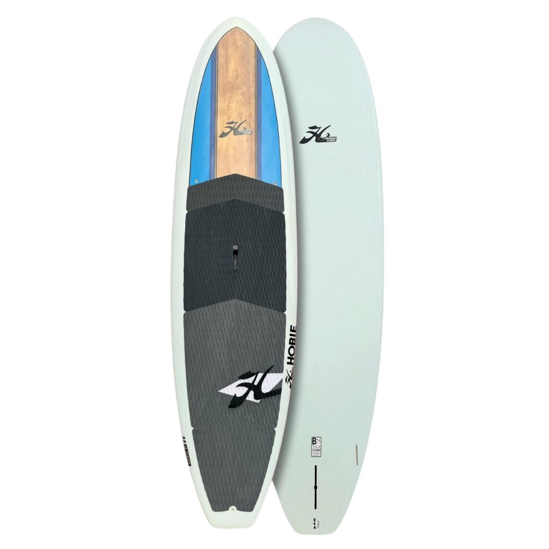 La construcción HCX de Hobie (Bamboo Composite Epoxy con núcleo ligero) proporciona rigidez estructural y durabilidad sin añadir peso innecesario, logrando un equilibrio excelente entre respuesta en las olas y confort al remar. La tabla presenta una cubierta más plana con cantos recogidos que incrementan la estabilidad, y un bottom con concave progresivo y doble concave en la cola, que ayuda a hacer giros cerrados y maniobras fluidas con gran impulso al salir de la curva.